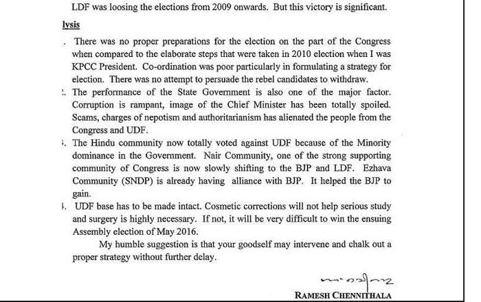 കൊച്ചി: രമേശ് ചെന്നിത്തല ഹൈക്കമാന്ഡിന് നല്കിയ കൊള്ളേണ്ടിടത്ത് തന്നെ കൊണ്ടുവെന്ന് വേണം വിലയിരുത്താന്. ഉമ്മന്ചാണ്ടി, രമേശ് ചെന്നിത്തല, വിഎം സുധാരന് എന്നിവരെയാണ് ഹൈക്കമാന്റ് ഡല്ഹിയ്ക്ക് വിളിപ്പിച്ചത്. സര്ക്കാരിനും ഉമ്മന്ചാണ്ടിക്കും എതിരെ ആഭ്യന്തരമന്ത്രി രമേശ് ചെന്നിത്തല ഹൈക്കമാന്ഡിന് അയച്ച കത്തിന്റെ പകര്പ്പ് പുറത്തുവന്നത് വിവാദമായിരുന്നു. ആഭ്യന്തര മന്ത്രി രമേശ് ചെന്നിത്തലയുമായി സോണിയ ഗാന്ധിയും, രാഹുല് ഗാന്ധിയും ചര്ച്ച നടത്തുമെന്നും അറിയിച്ചിട്ടുണ്ട്. കേരളത്തില് യുഡിഎഫും കോണ്ഗ്രസും നേരിടുന്ന തിരിച്ചടികള്ക്ക് കാരണം മുഖ്യമന്ത്രി ഉമ്മന്ചാണ്ടിയാണെന്ന് കാട്ടി ആഭ്യന്തരമന്ത്രി രമേശ് ചെന്നിത്തല എഴുതിയ കത്തിന്റെ പകര്പ്പ് ് ഇക്കണോമിക് ടൈംസ് പത്രമാണ് പുറത്തുവിട്ടത്. സംസ്ഥാനത്തിനുള്ളിലെ കോണ്ഗ്രസ് പാര്ട്ടിയിലെ പ്രശ്നങ്ങള് ചൂണ്ടിക്കാണിച്ച് ഹൈക്കമാന്ഡിന് കഴിഞ്ഞമാസം അയച്ച കത്തിലാണ് ഉമ്മന്ചാണ്ടിക്കെതിരെ രമേശ് ചെന്നിത്തല രംഗത്തെത്തിയത്.മുഖ്യമന്ത്രി എന്ന നിലയില് ഉമ്മന്ചാണ്ടിയുടെ പ്രതിച്ഛായക്കേറ്റ മങ്ങലാണ് തദ്ദേശ തെരഞ്ഞെടുപ്പിലടക്കം യുഡിഎഫ് നേരിട്ട പരാജയങ്ങള്ക്ക് കാരണമെന്നും, സര്ക്കാരില് അഴിമതി വ്യാപകമാണെന്നും, നിലവില് യുഡിഎഫ് സര്ക്കാരിന്റെ ഭരണം സമ്പൂര്ണ പരാജയമാണെന്നും ചെന്നിത്തല കത്തില് വിശദമാക്കുന്നുണ്ട്. കേരളത്തില് ബിജെപി ശക്തിപ്രാപിച്ചുവരികയാണെന്നും, ഇക്കാര്യങ്ങള് വിശദമായി പരിശോധിക്കണമെന്നും കത്തില് രമേശ് ചെന്നിത്തല ആവശ്യപ്പെടുന്നുണ്ട്. സംസ്ഥാനത്തെ ഹിന്ദുമത വിശ്വാസികള് ബിജെപിയോട് അടുത്തുകൊണ്ടിരിക്കുകയാണെന്നും, കോണ്ഗ്രസിനെ ശക്തമായി പിന്തുണച്ചിരുന്ന നായര് സമുദായം ബിജെപി അനുഭാവം കാട്ടുകയാണെന്നും കത്തില് പറയുന്നുണ്ട്. അതേസമയം തദ്ദേശ തെരഞ്ഞെടുപ്പ് ഫലങ്ങളുമായി ബന്ധപ്പെട്ട് രണ്ടുദിവസം കെപിസിസി ചര്ച്ചകളും, വിലയിരുത്തലും നടത്തിയതാണെന്നും, അവിടെ ചര്ച്ചയില് വരാത്ത കാര്യങ്ങളൊന്നും തന്നെ ഉണ്ടായിട്ടില്ലെന്നും കെപിസിസി പ്രസിഡന്റ് വി.എം.സുധീരന്. രമേശ് ചെന്നിത്തല കോണ്ഗ്രസ് ഹൈക്കമാന്ഡിന് അയച്ചതായി മാധ്യമങ്ങള് പറയുന്ന കത്തിന്റെ ആധികാരികത വേണമെങ്കില് പരിശോധിക്കുമെന്നും സുധീരന് പറഞ്ഞു. സംഭവത്തോടെ കോണ്ഗ്രസ് വലിയ പൊട്ടിത്തെറിയിലേക്കാണ് നീങ്ങുന്നത്. ചെന്നിത്തലയ്ക്കെതിരെ വിഎം സുധീരനും എ ഗ്രൂപ്പും ഒരുപോലെ പടവാളോങ്ങിക്കഴിഞ്ഞു.