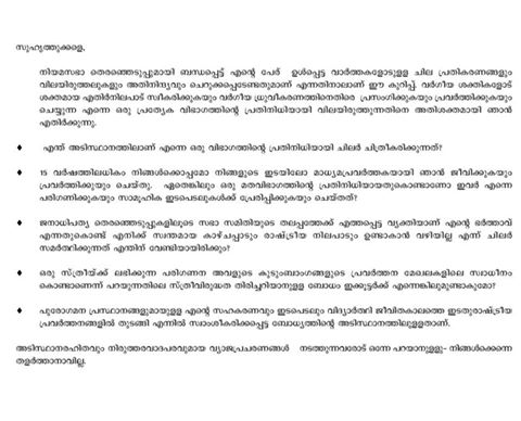 കൊച്ചി: നിയമസഭാ തിരഞ്ഞെടുപ്പില് ആറന്മുള എല്ഡിഎഫ് സ്ഥാനാര്ഥിയായി പറഞ്ഞുകേള്ക്കുന്ന വീണജോര്ജ്ജ് വിമര്ശകള്ക്ക് കുറിക്കുകൊള്ളുന്ന മറുപടിയുമായി രംഗത്തെത്തി. ഫെയ്സ്ബുക്കില് ഇതുസംബന്ധിച്ച് തന്റെ നിലപാട് പത്രക്കുറിപ്പ് രൂപത്തിലാണ് പോസ്റ്റ് ചെയ്തിട്ടുള്ളത്. വര്ഗീയ ശക്തികള്ക്കെതിരെയും വര്ഗീയ ധ്രുവീകരണത്തിനുമെതിരെ ശബ്ദിക്കുന്ന തന്നെ ഒരു പ്രത്യേക വിഭാഗത്തിന്റെ ആളായി മുദ്രകുത്താനാണ് ശ്രമം. 15 വര്ഷത്തോളമായി മാധ്യമപ്രവര്ത്തകയായി ഞാന് നിങ്ങള്ക്കൊപ്പമുണ്ട്. സഭാതലപ്പത്താണ് എന്റെ ഭര്ത്താവെന്നിരിക്കെ ഞാനെങ്ങനെയൊരു മതവിഭാഗത്തിന്റെ പ്രതിനിധിയാകുമെന്നും ഇവര് ചോദിക്കുന്നു.ഒരു സ്ത്രീക്ക് ലഭിക്കുന്ന പരിഗണന അവളുടെ കുടുംബാംഗങ്ങളുടെ പ്രവര്ത്തനമേഖലകളിലെ സ്വാധീനംകൊണ്ടാണെന്ന് പറയുന്നതിലെ സ്ത്രീവിരുദ്ധത തിരിച്ചറിയാനുള്ള ബോധം വിമര്ശകര്ക്കുണ്ടാകണമെന്നും വീണയുടെ പോസ്റ്റിലുണ്ട്.