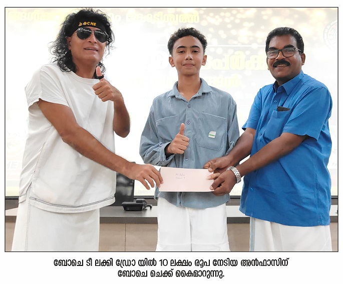 തൃശൂര്: ദിവസേന 10 ലക്ഷം രൂപ സമ്മാനമായി നല്കുന്ന ബോചെ ടീ ലക്കി ഡ്രോ യിലെ വിജയിയായ അന്ഫാസിന് 10 ലക്ഷം രൂപയുടെ ചെക്ക് കൈമാറി. തൃശൂരില് നടന്ന ചടങ്ങിലാണ് ചെക്ക് കൈമാറിയത്. കില ചെയര്മാന് കെ.എന്. ഗോപിനാഥന് അധ്യക്ഷനായി. പെരിന്തല്മണ്ണ സ്വദേശിയാണ് അന്ഫാസ്. ദിവസേനയുള്ള നറുക്കെടുപ്പിലൂടെ 10 ലക്ഷം രൂപയും കൂടാതെ 13704 ഭാഗ്യവാന്മാര്ക്ക് 25000, 10000, 5000, 1000, 100 എന്നിങ്ങനെ ക്യാഷ് പ്രൈസുകളും ലഭിക്കുന്നുണ്ട്. 25 കോടി രൂപയാണ് ബമ്പര് സമ്മാനം. www.bochetea.com സന്ദര്ശിച്ച് 40 രൂപയുടെ ബോചെ ടീ വാങ്ങുമ്പോള് സൗജന്യമായി ബോചെ ലക്കി ഡ്രോ ടിക്കറ്റ് ലഭിക്കും. എല്ലാ ദിവസവും രാത്രി 10.30 നാണ് നറുക്കെടുപ്പ്. ബോചെ ടീ യുടെ വെബ്സൈറ്റ്, സോഷ്യല് മീഡിയ അക്കൗണ്ടുകള് എന്നിവ വഴിയാണ് നറുക്കെടുപ്പ് ഫലം പ്രസിദ്ധീകരിക്കുന്നത്. ബോചെ ഗോള്ഡ് ആന്റ് ഡയമണ്ട്സ്, ബോചെ ടീ, ബോചെ ഗോള്ഡ് ലോണ് എന്നിവയുടെ ‘ബോചെ പാര്ട്ണര്’ ബിസിനസ് അവസരങ്ങള്ക്ക് 7034187000 എന്ന നമ്പറില് ബന്ധപ്പെടാവുന്നതാണ്.