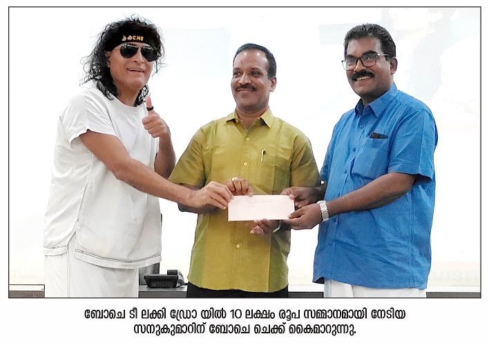 തൃശൂര്: ദിവസേന 10 ലക്ഷം രൂപ സമ്മാനമായി നല്കുന്ന ബോചെ ടീ ലക്കി ഡ്രോ യിലെ വിജയിയായ സനുകുമാറിന് 10 ലക്ഷം രൂപയുടെ ചെക്ക് കൈമാറി. തൃശൂരില് നടന്ന ചടങ്ങിലാണ് ചെക്ക് കൈമാറിയത്. കില ചെയര്മാന് കെ.എന്. ഗോപിനാഥന് അധ്യക്ഷനായി. തിരുവനന്തപുരം ആറ്റിങ്ങല് അലങ്കോട് സ്വദേശിയാണ് സനുകുമാര്. ദിവസേനയുള്ള നറുക്കെടു പ്പിലൂടെ 10 ലക്ഷം രൂപയും കൂടാതെ 13704 ഭാഗ്യവാന്മാര്ക്ക് 25000, 10000, 5000, 1000, 100 എന്നിങ്ങനെ ക്യാഷ് പ്രൈസുകളും ലഭിക്കുന്നുണ്ട്. 25 കോടി രൂപയാണ് ബമ്പര് സമ്മാനം.www.bochetea.com സന്ദര്ശിച്ച് 40 രൂപയുടെ ബോചെ ടീ വാങ്ങുമ്പോള് സൗജന്യമായി ബോചെ ലക്കി ഡ്രോ ടിക്കറ്റ് ലഭിക്കും. എല്ലാ ദിവസവും രാത്രി 10.30 നാണ് നറുക്കെടുപ്പ്. ബോചെ ടീ യുടെ വെബ്സൈറ്റ്, സോഷ്യല് മീഡിയ അക്കൗണ്ടുകള് എന്നിവ വഴിയാണ് നറുക്കെടുപ്പ് ഫലം പ്രസിദ്ധീകരിക്കുന്നത്. ബോചെ ഗോള്ഡ് ആന്റ്