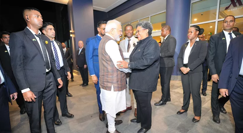 വിമാനത്താവളത്തില്നിന്നു ഹോട്ടലിലെത്തിയ മോദിയെ സ്വീകരിക്കാന് ഗ്രെനേഡ, ബാര്ബഡോസ് രാജ്യങ്ങളിലെ പ്രധാനമന്ത്രിമാരും എത്തിയിരുന്നു. ഗയാനയും ബാര്ബഡോസും തങ്ങളുടെ പരമോന്നത പുരസ്കാരങ്ങള് പ്രധാനമന്ത്രി നരേന്ദ്ര മോദിക്ക് സമ്മാനിക്കുമെന്ന് പ്രഖ്യാപിച്ചിട്ടുണ്ട്.