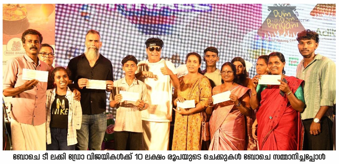 ബോചെ ടീ ലക്കി ഡ്രോ വിജയികള്ക്ക് സമ്മാനമായി ലഭിച്ച 10 ലക്ഷം രൂപയുടെ ചെക്ക് സമ്മാനിച്ചു. കോഴിക്കോട് ബീച്ചില് നടന്ന പരിപാടിയില് ബോചെ ചെക്കുകള് വിതരണം ചെയ്തു. കോഴിക്കോട് സ്വദേശി ദിവ്യ എന്.എം., തിരുവനന്തപുരം സ്വദേശി ലതിക എസ്., കണ്ണൂര് സ്വദേശികളായ ഫിറോസ്, ഇസ്മയില് സി.കെ, ഇടുക്കി സ്വദേശി ലയ ജെയിംസ്, ആലപ്പുഴ സ്വദേശി ആന്റണി പി.ജെ. എന്നിവര്ക്കാണ് 10 ലക്ഷം രൂപ സമ്മാനമായി ലഭിച്ചത്.