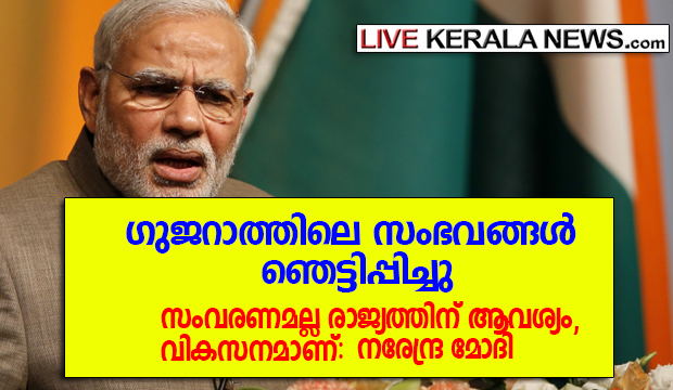 അക്രമങ്ങൾ ഉണ്ടായത് നിർഭാഗ്യകരമായ കാര്യമാണ്. വേഗം തന്നെ ഗുജറാത്തിൽ സമാധാനം തിരിച്ചു വന്നതിൽ സന്തോഷമുണ്ടെന്നും മോദി പറഞ്ഞു. സംവരണമല്ല രാജ്യത്തിന് വേണ്ടത്, വികസനമാണ്. അതിനായി ഒറ്റമനസോടെ പ്രവർത്തിക്കുകയാണ് വേണ്ടതെന്നും മോദി ചൂണ്ടിക്കാട്ടി.